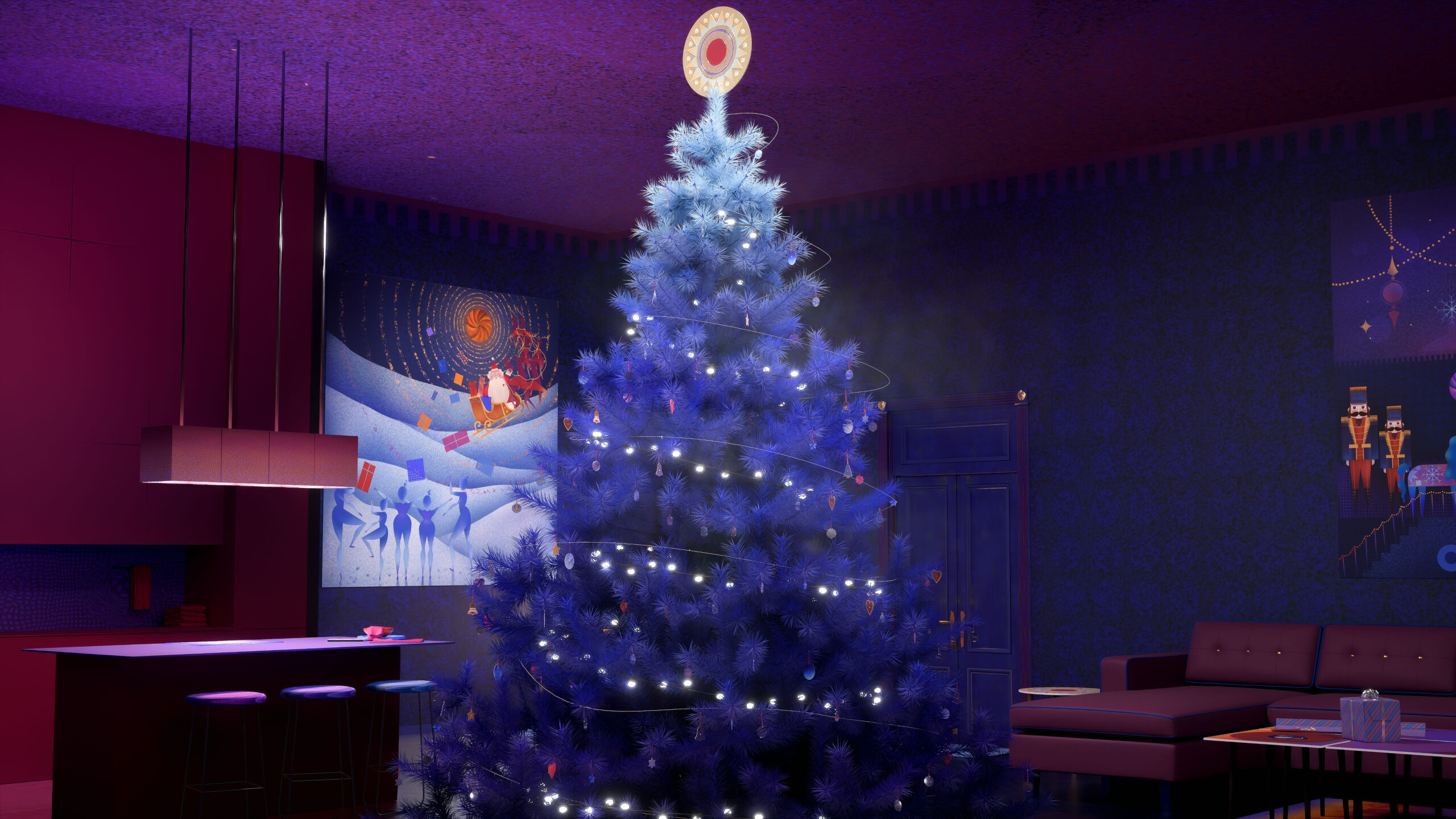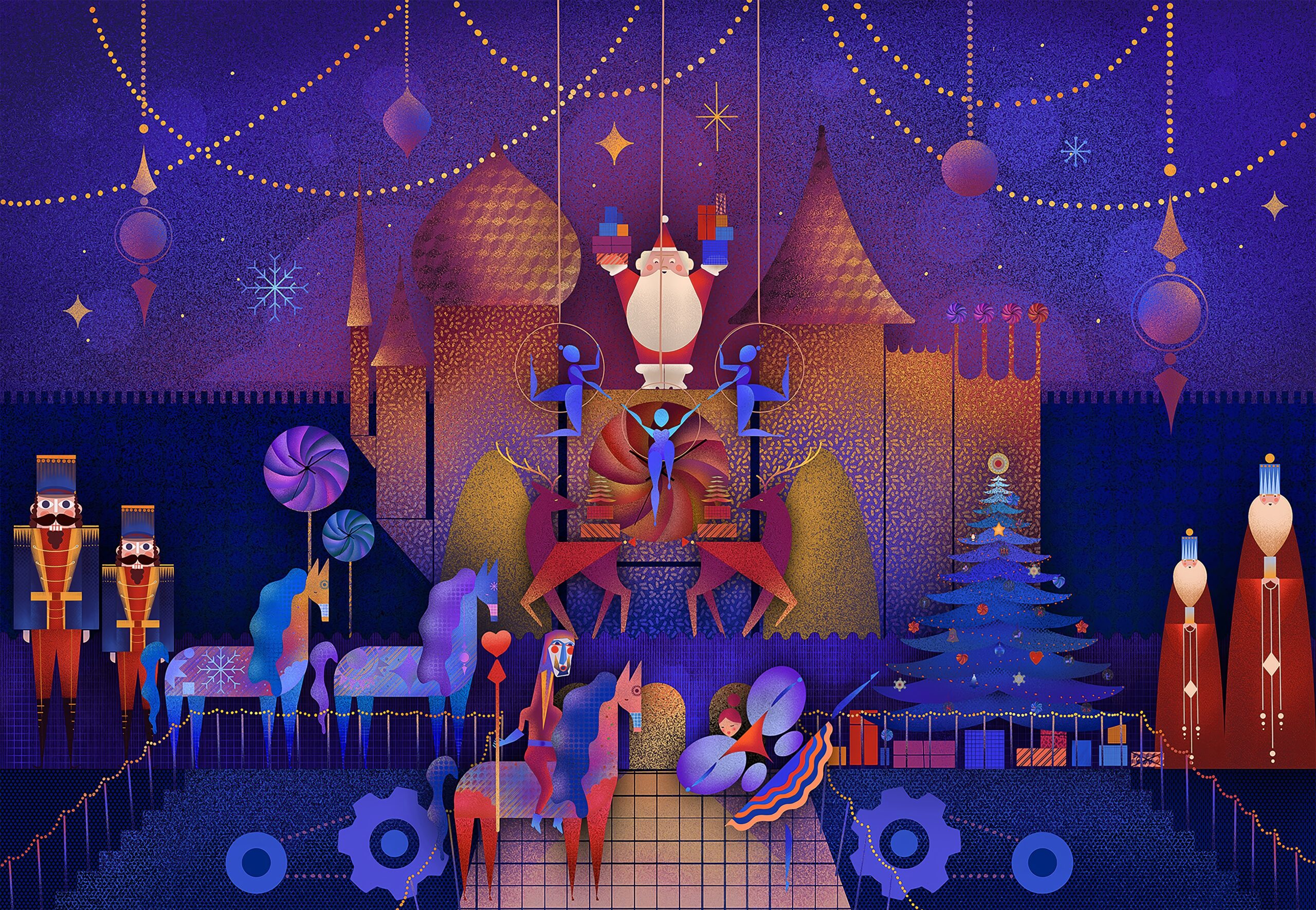 “Castle of Gifts” is where Christmas gets a magnificent, slightly goofy makeover! Santa’s clearly decided to show off his balancing skills, while the majestic horses and stoic nutcrackers look on, probably wondering where they can grab one of those giant lollipops. It’s a dazzling, purple-and-gold winter wonderland that proves holiday cheer is always best served with a side of spectacular, high-kicking ballet.